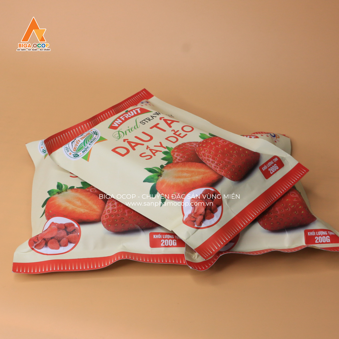 Dâu tây Mộc Châu sấy dẻo là sản phẩm OCOP 4 sao nổi bật, mang đến hương vị độc đáo của cao nguyên Mộc Châu – nơi nổi tiếng với khí hậu lý tưởng để trồng giống dâu cao cấp. Được chế biến từ hai giống dâu HANA và AKI có nguồn gốc từ Nhật Bản và Hàn Quốc, sản phẩm không chỉ giữ nguyên hương vị ngọt ngào mà còn đảm bảo chất lượng vượt trội, đáp ứng các tiêu chuẩn OCOP khắt khe.